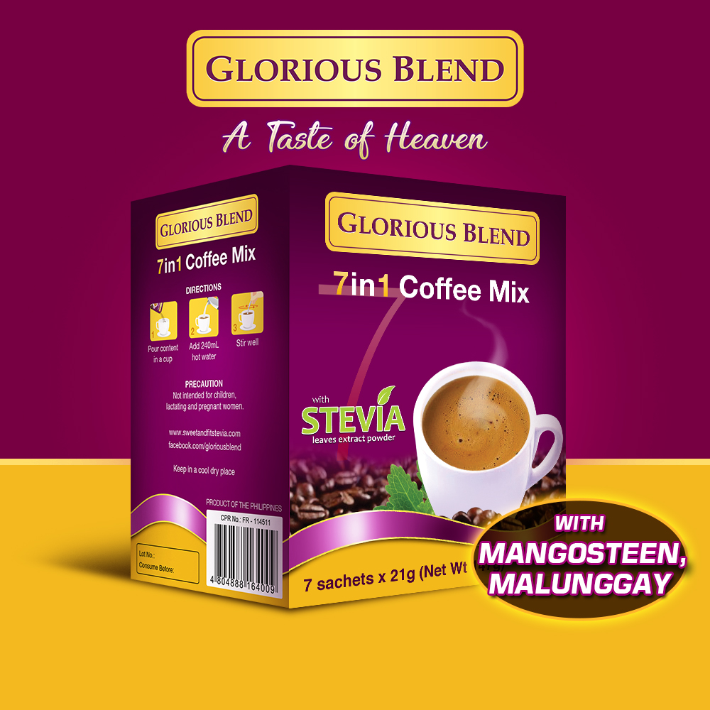 Experience the taste of heaven with Glorious Blend 7in1 Coffee. This special blend is made with carefully selected ingredients including Malungay, Mangosteen, Calcium, Goto Kola, and sweetened with Sweet & Fit Stevia.